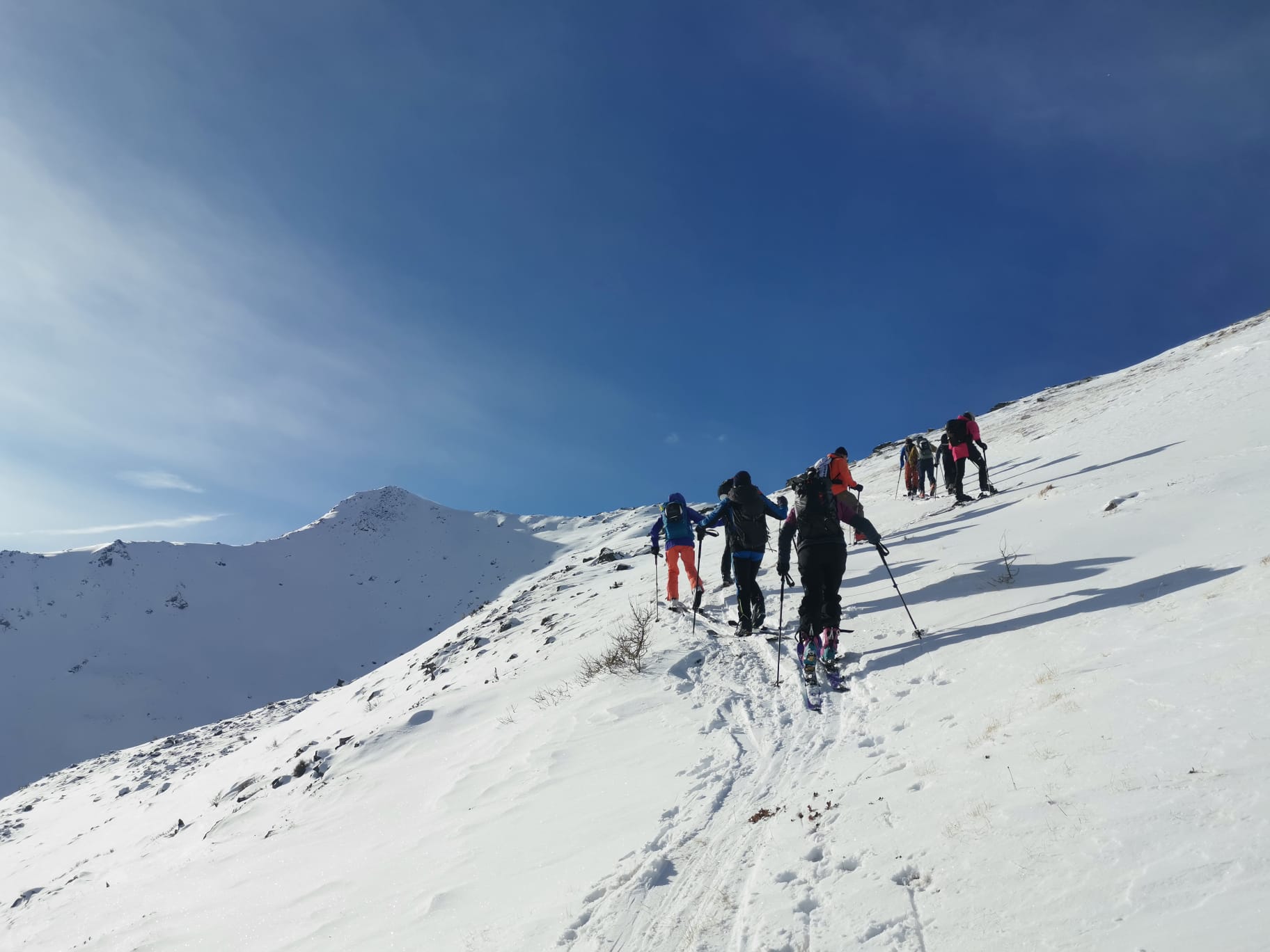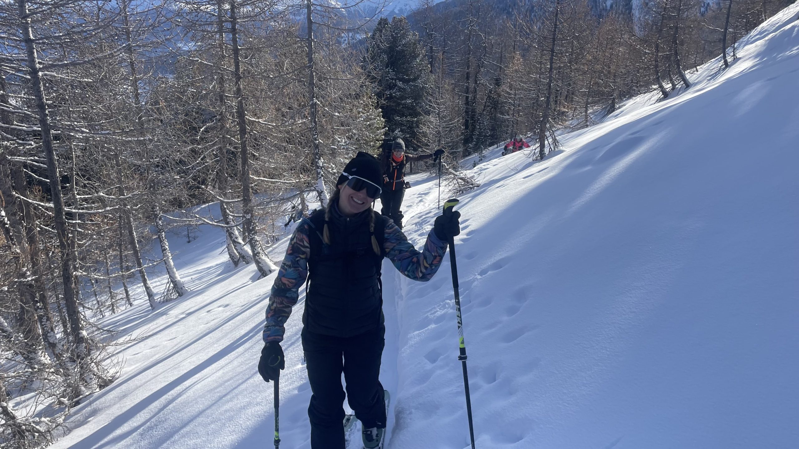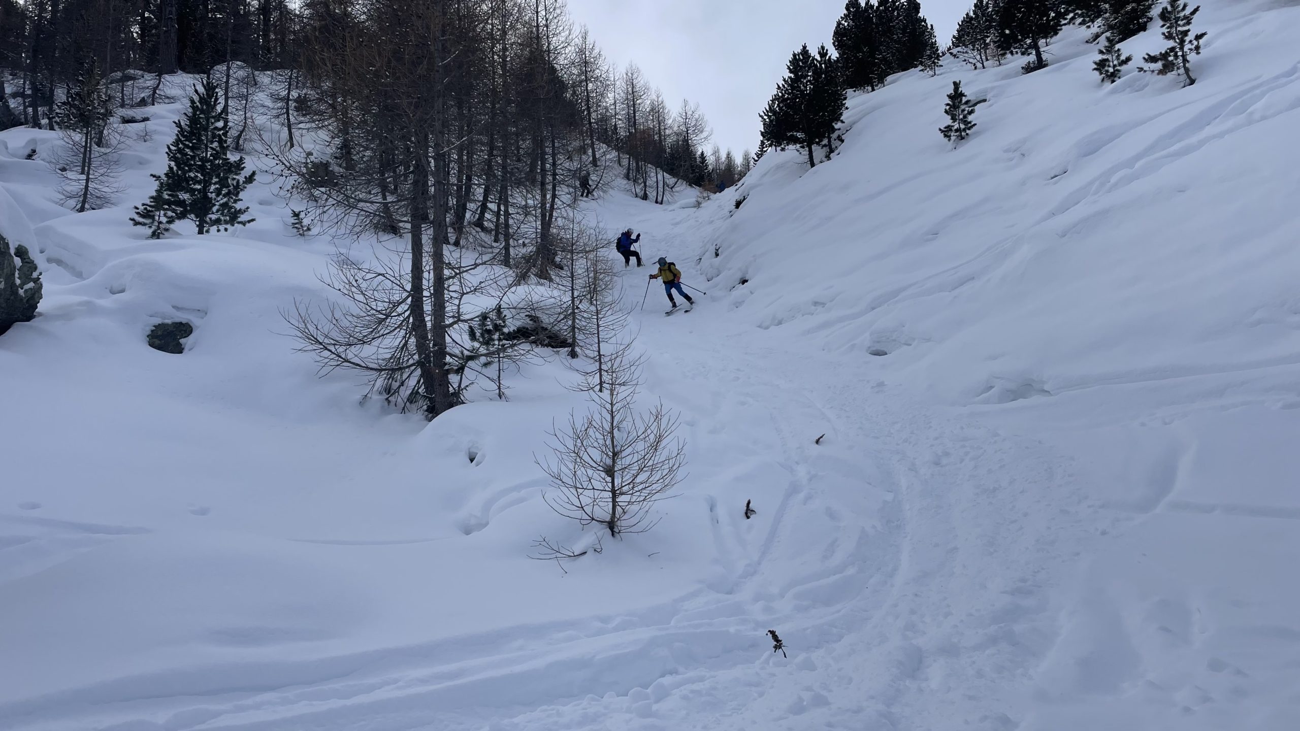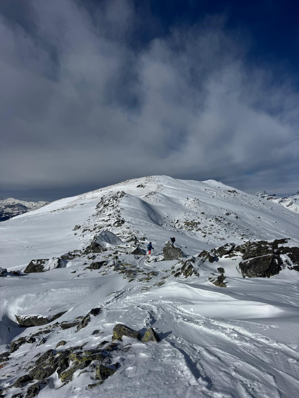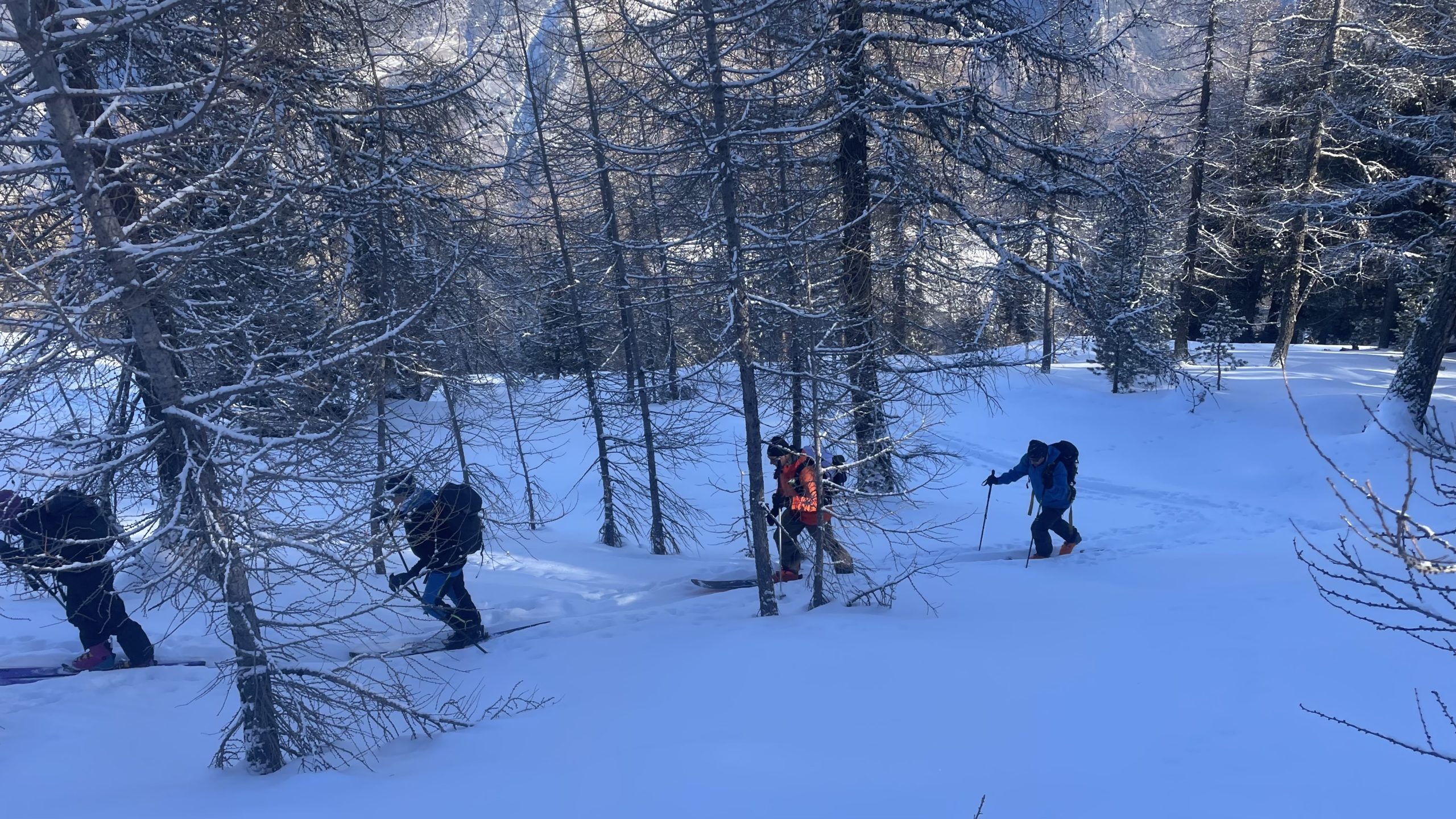 En sortant de la forêt, l’ambiance change : le vent s’est invité au-dessus, et la neige nettement soufflée nous accueille au col (~2750 m). Après une pause bien méritée et un rapide check météo–moral–orteils, le groupe se livre à un exercice rare mais précieux : un vote collectif. Verdict : on renonce au sommet. Neige peu engageante, vent frais, et quelques doigts franchement pas enthousiastes — sagesse alpine validée.