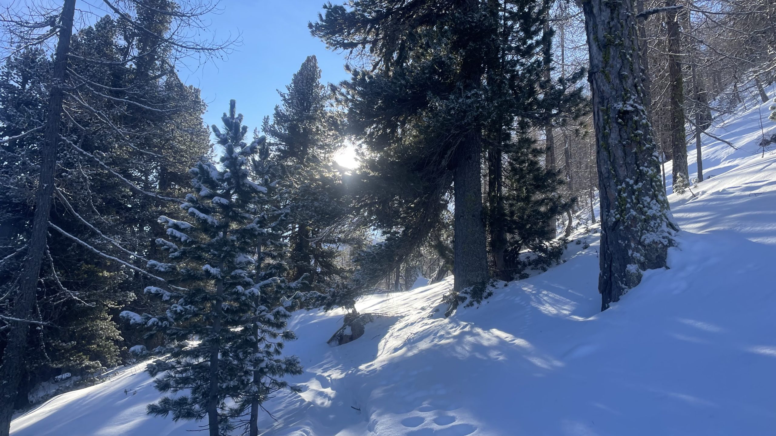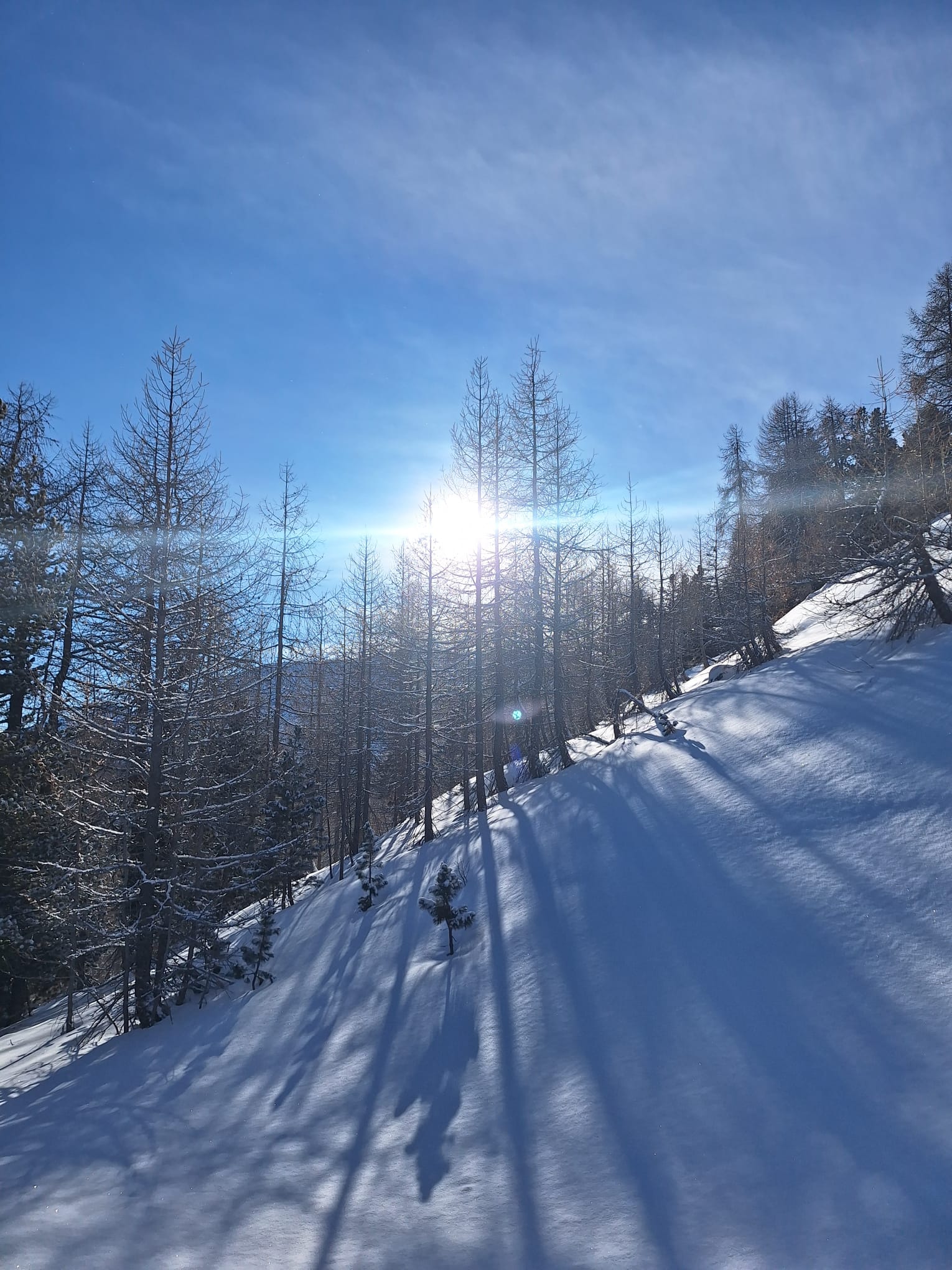 La montagne ne nous en veut pas et nous récompense aussitôt. À la descente, de superbes pans de poudreuse nous attendent, joueurs et légers, avant un retour tout en fluidité dans la forêt. Les virages s’enchaînent, les sourires aussi, et l’on rejoint tranquillement le bas de la piste, satisfaits et légèrement affamés.