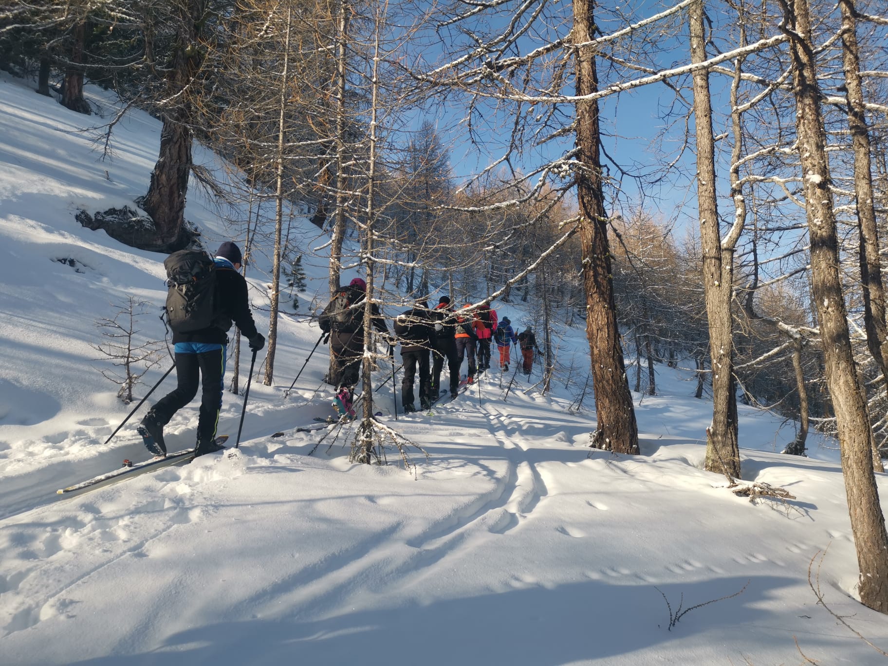 La montée débute par une belle traversée en forêt, ambiance carte postale, silence feutré et traces fraîches. Le rythme est bon, les discussions vont bon train, et personne n’avoue encore avoir froid (mais certains y pensent déjà).