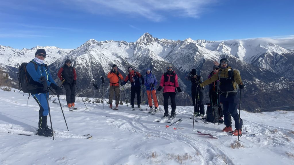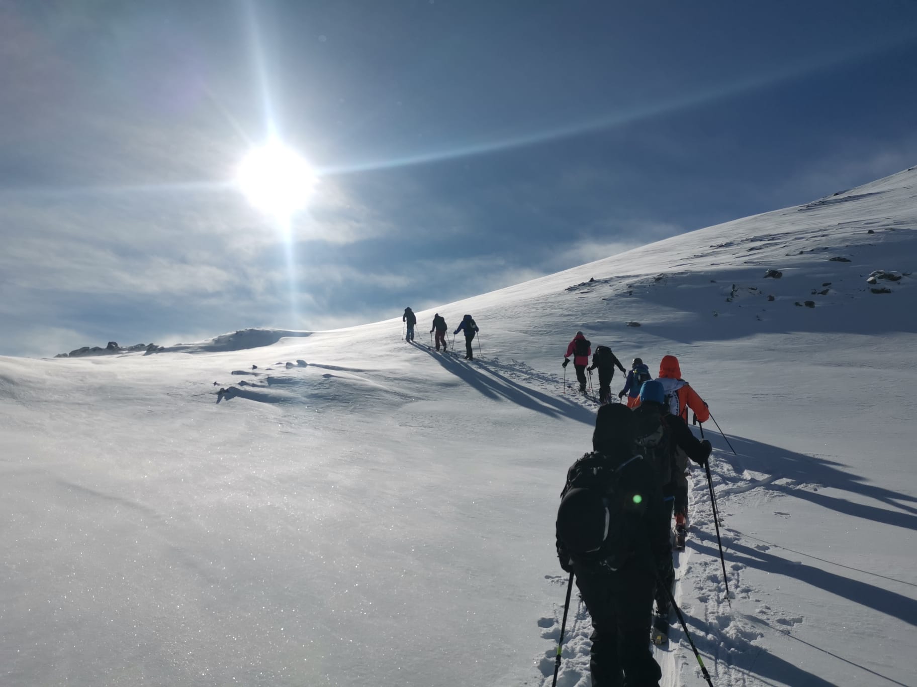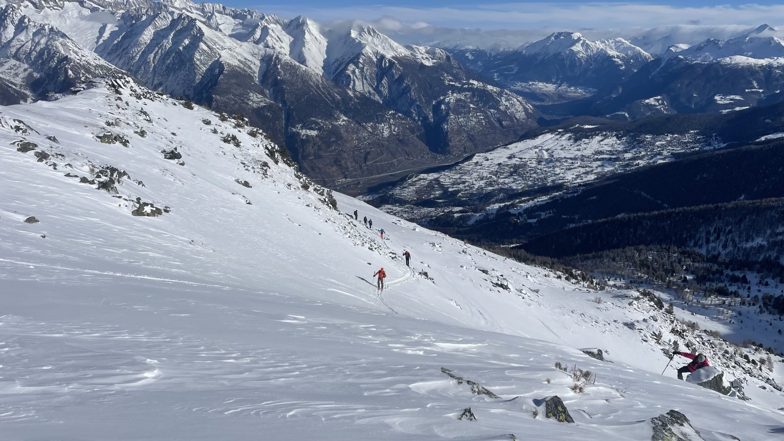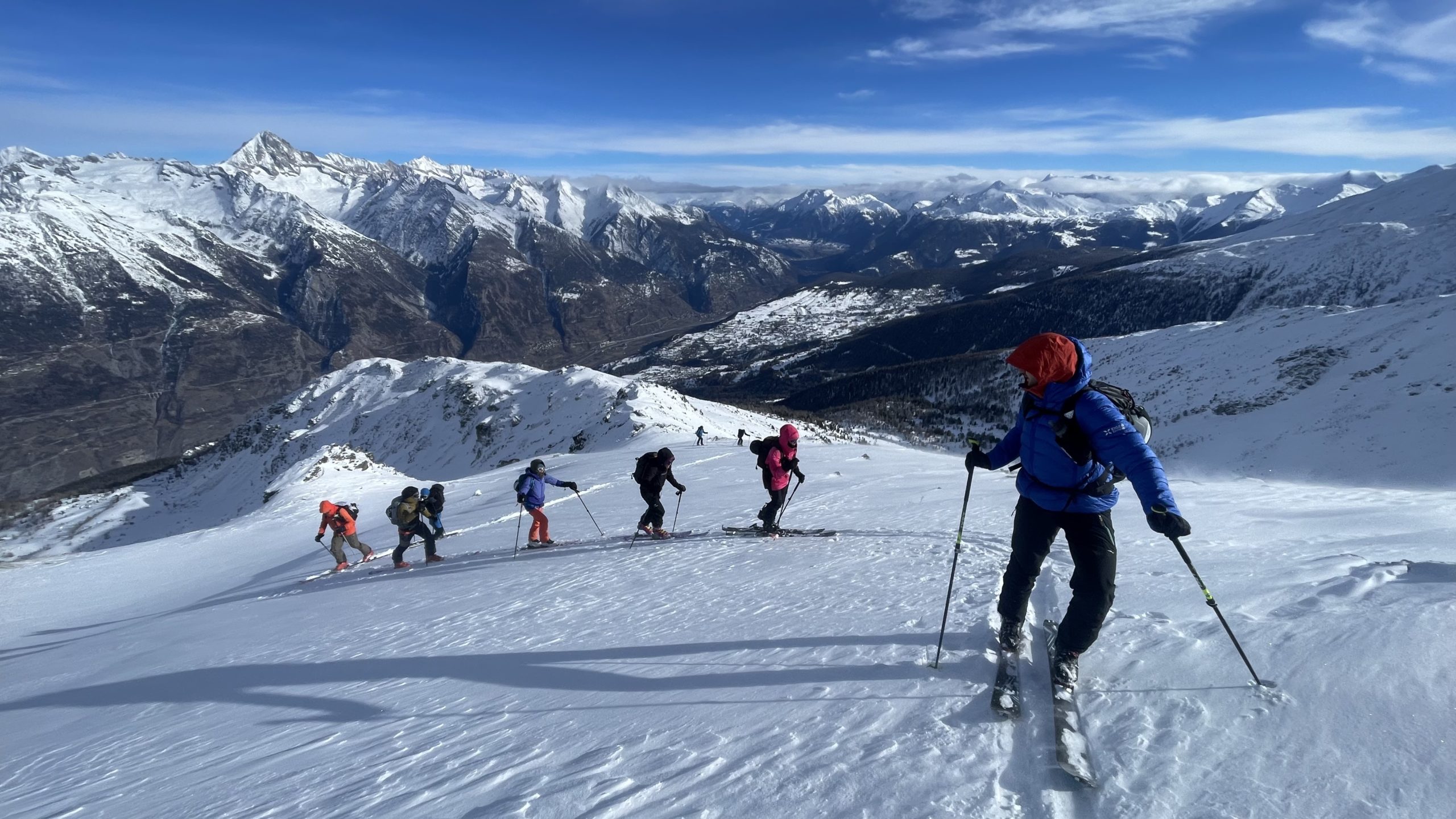 Dès le départ, le décor est planté : grand soleil, ciel bleu insolent, mais un danger d’avalanche annoncé à 3 qui nous rappelle que la montagne, elle, ne plaisante jamais. Thomas, notre chef de course, cadre le plan avec calme pendant que chacun ajuste peaux et couches.