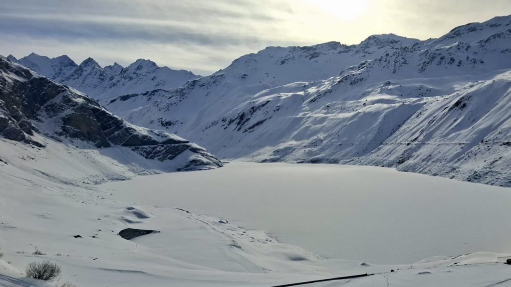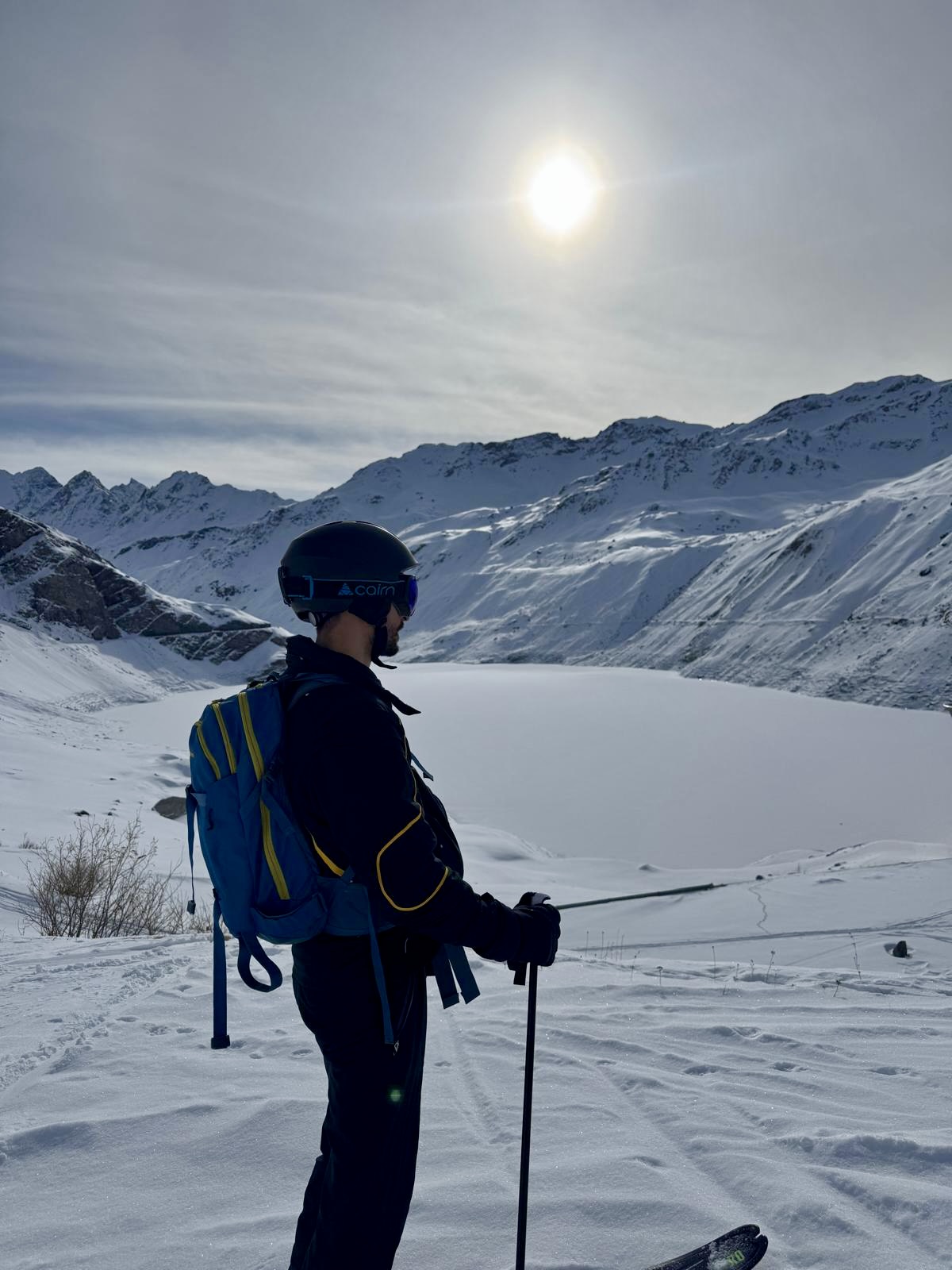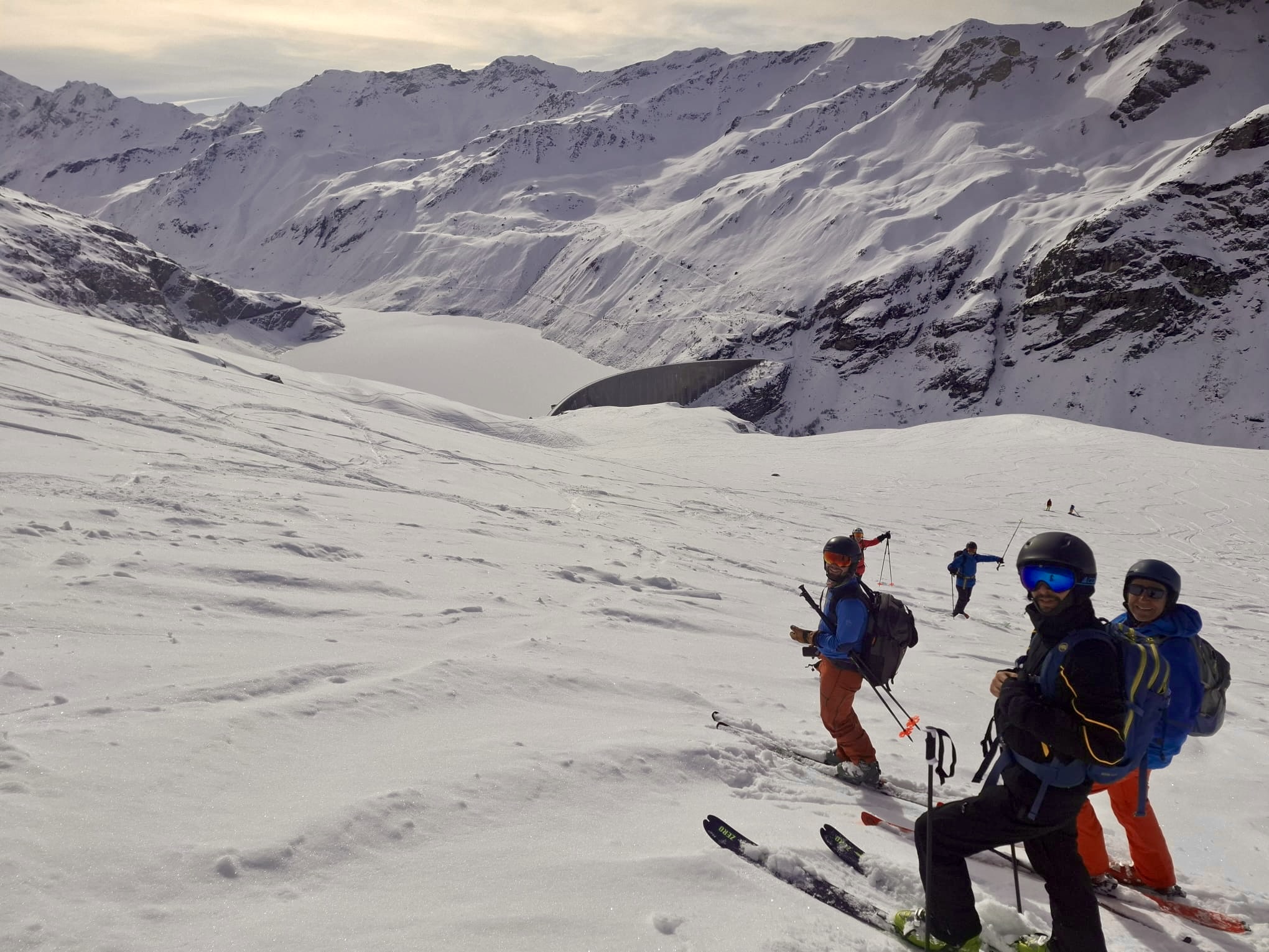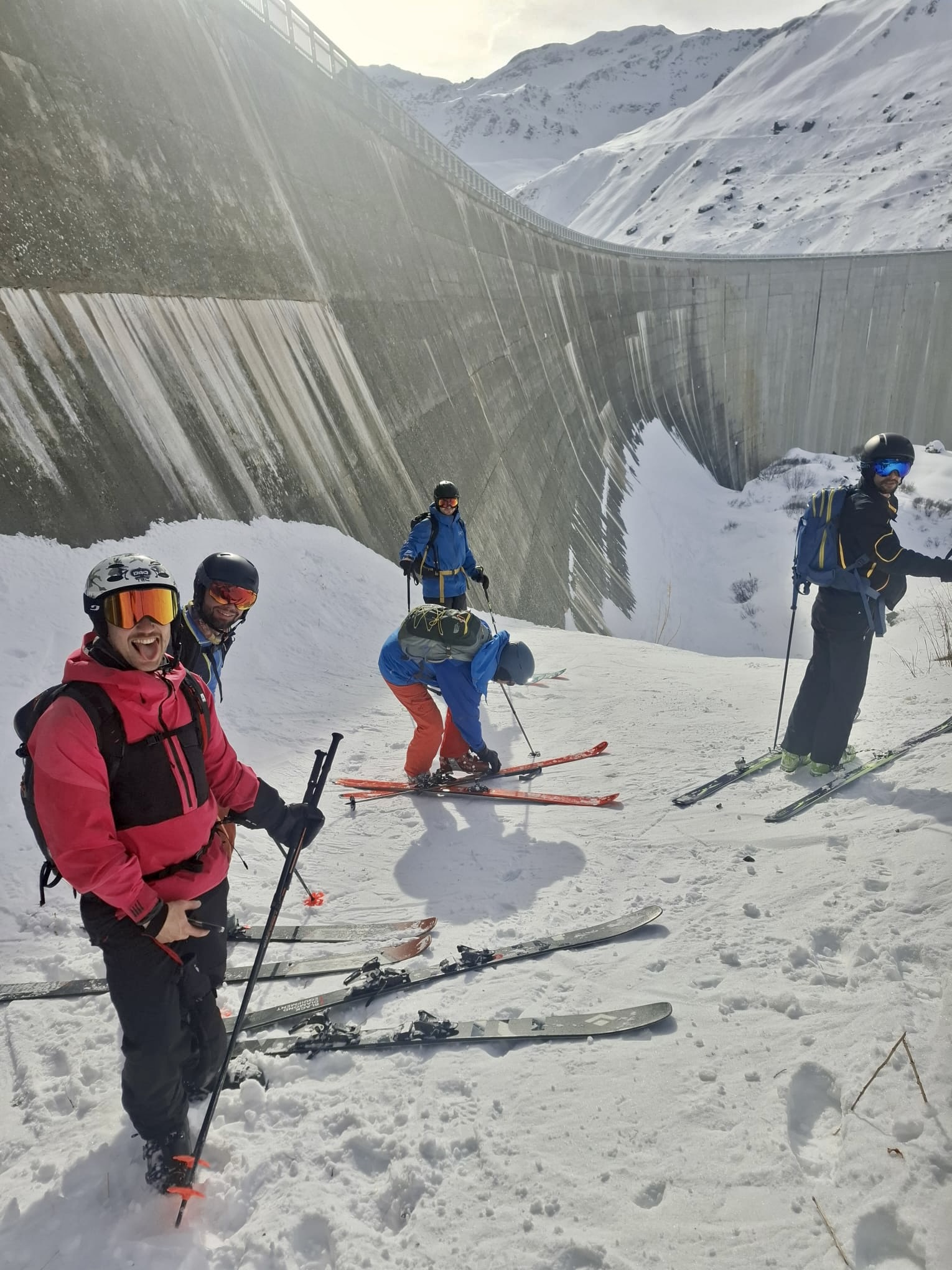 Après un repas bien mérité, direction Zinal pour la suite : encore deux belles descentes, l’une dans le domaine Free-Ride, l’autre jusqu’au barrage de Moiry. Là, un dernier exercice de lucidité collective : une plaque de glace bleue nous barre la route… et décision unanime de remonter un peu pour choisir une variante plus sûre en traversant le barrage. Les jambes protestent, mais la montagne, elle, apprécie toujours les décisions prudentes : s’il y a un doute, alors il n’y a aucun doute.