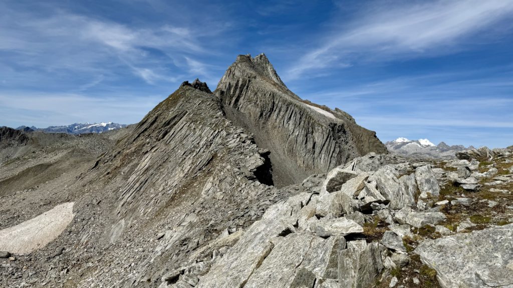Sous un ciel limpide, un monde de cimes s’est ouvert devant moi : le glacier du Basodino, celui du Blinnenhorn, les lointains du Grimsel et la pureté de l’Oberaarhorn. Et face à nous, imposante, la crête élancée qui mène au Pizzo Gallina, fière et souveraine.